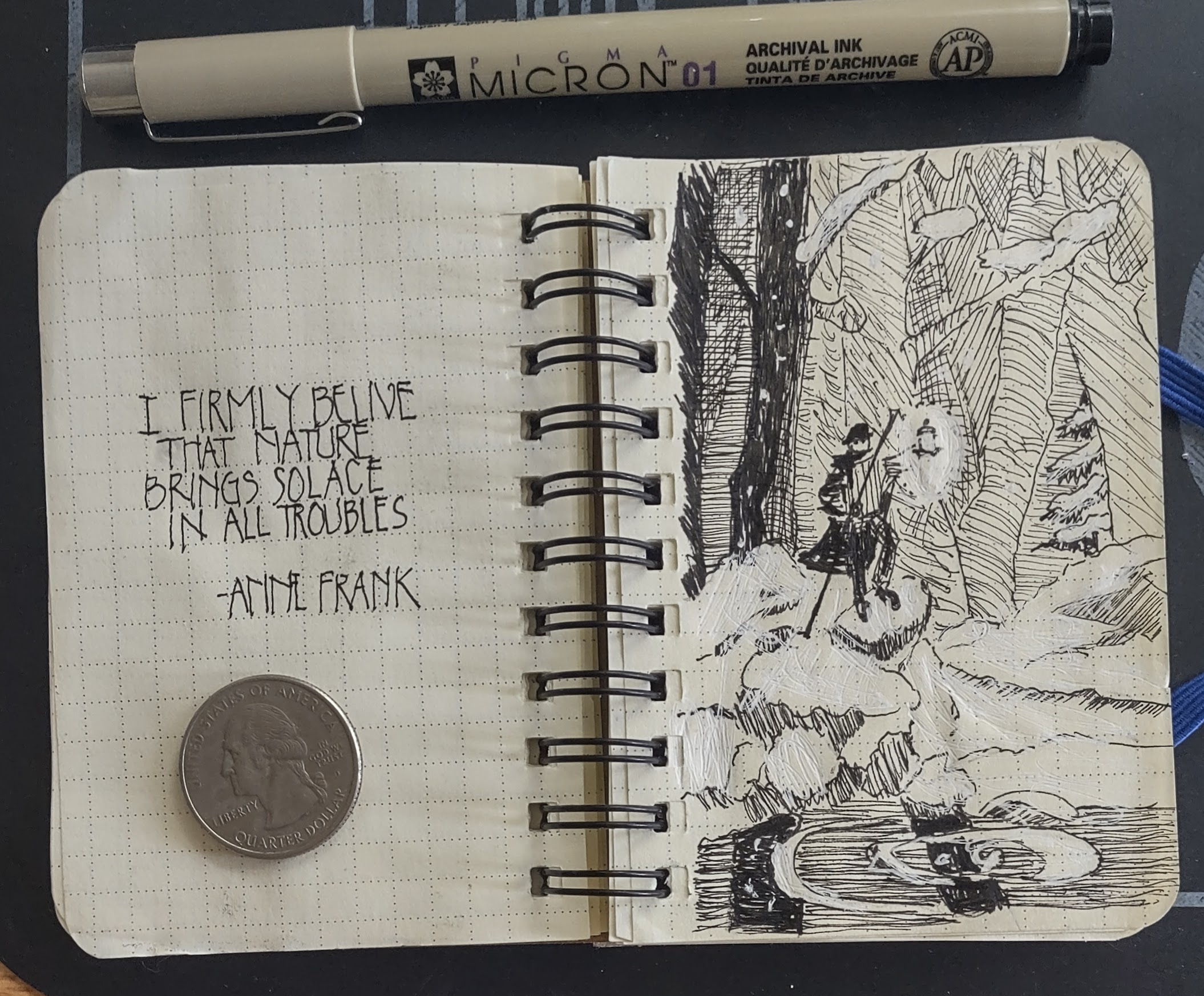 I had purchased an art journal for Inktober. It was a challenge to do just in on a gray paper. I picked ot my favorites. Inspired by my road trip from Texas to Washington state Oregon, California and back home though Arizonia and New Mexico.